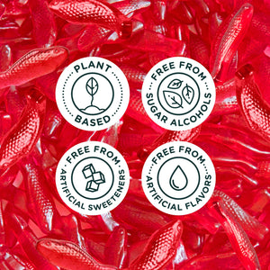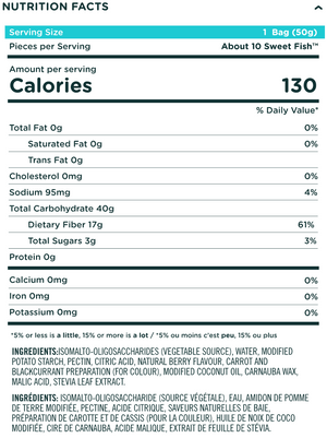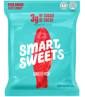Spoil yourself with the delicious Sweet Fish by Smart Sweets! Our new recipe includes an impressive 92% less sugar than competing brands, and with only 3 grams of sugar per bag, these fish are the captain of #TeamSweet! Our plant-based candy is also free from sugar alcohols, artificial sweeteners, and added sugar. Enjoy a guilt-free treat with only 17 grams of plant-based fibre for the whole bag and only 4 SmartPoints for the whole bag.