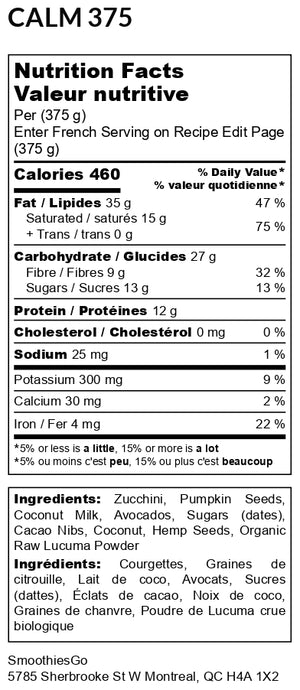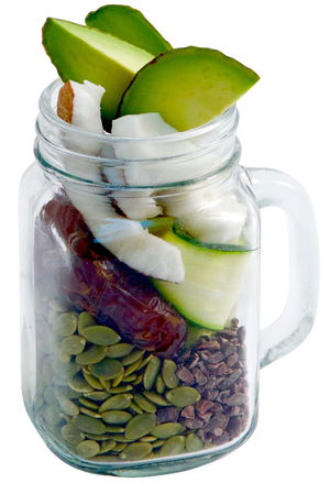 Ingrédients : courgette, avocat, graines de citrouille, dattes, éclats de cacao bio, lait de coco bio, noix de coco bio, poudre de protéine de chanvre, lucuma bio