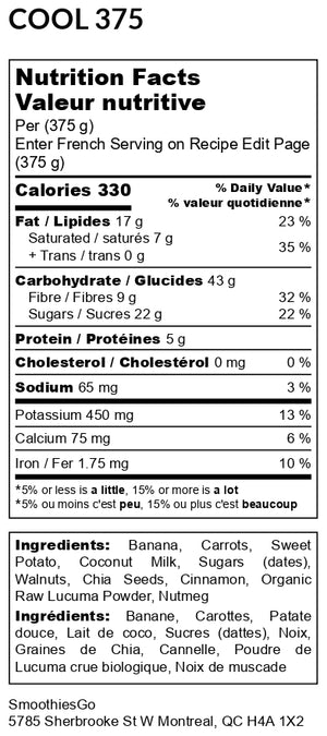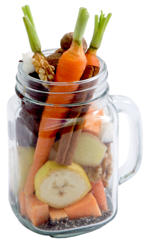 Ingrédients : Bananes, Carottes, Patates douces, Dattes, Noix, Lait de coco bio, Graines de chia bio, Cannelle bio, Lucuma bio, Noix de muscade