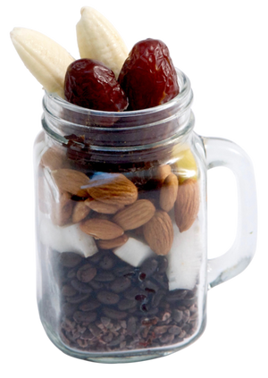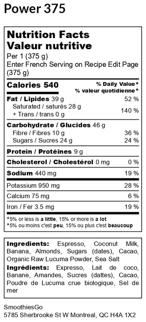 Ingrédients : Bananes, café expresso, lait de coco biologique, amandes, dattes, poudre de cacao biologique, lucuma biologique, sel de l'Himalaya