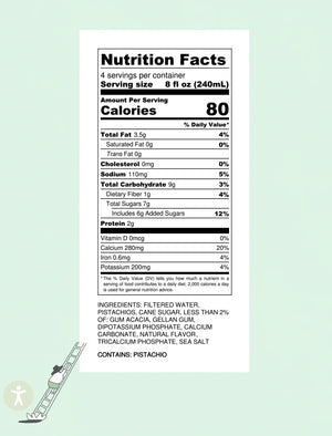 Ingredients: Filtered Water, Pistachios, Cane Sugar, Less than 2% of: Gum Acacia, Gellan Gum, Dipotassium Phosphate, Calcium Carbonate, Natural Flavour, Tricalcium Phosphate, Sea Salt