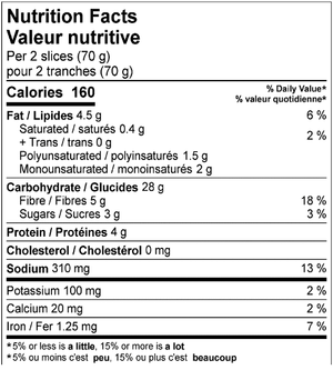 Water, organic gluten-free flour blend (organic brown rice flour, organic tapioca starch, organic sorghum flour, organic potato starch, organic millet flour, organic chickpea flour, organic oat flour), organic sunflower oil, organic cane sugar, organic psyllium husk, organic ground flaxseed, yeast, organic pea protein, xanthan gum, sea salt, organic vinegar, organic pea hull fibre, cultured cane sugar.