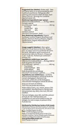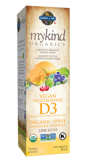 mykind Organics Certified Organic Whole Food Vegan D3 Spray is a delicious vanilla spray made with organic foods. In a base of Organic Pumpkin Seed Oil and Organic Cranberry Seed Oil for optimum absorption, one spray daily delivers 1,000IU of vegan vitamin D3 as cholecalciferol to help support calcium absorption for healthy bones, and support immune system function. This great vitamin D supplement is for everyone, and it’s made with Vitashine® Vegan Certified vitamin D from lichen—not lanolin. Made without any artificial ingredients or chemical preservatives and no added sugars —just wholesome food with delicious organic flavour and organic stevia.