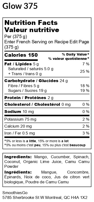 Ingredients: Mangoes, Cucumber, Spinach, Lime, Organic Coconut, Organic Camu Camu.
