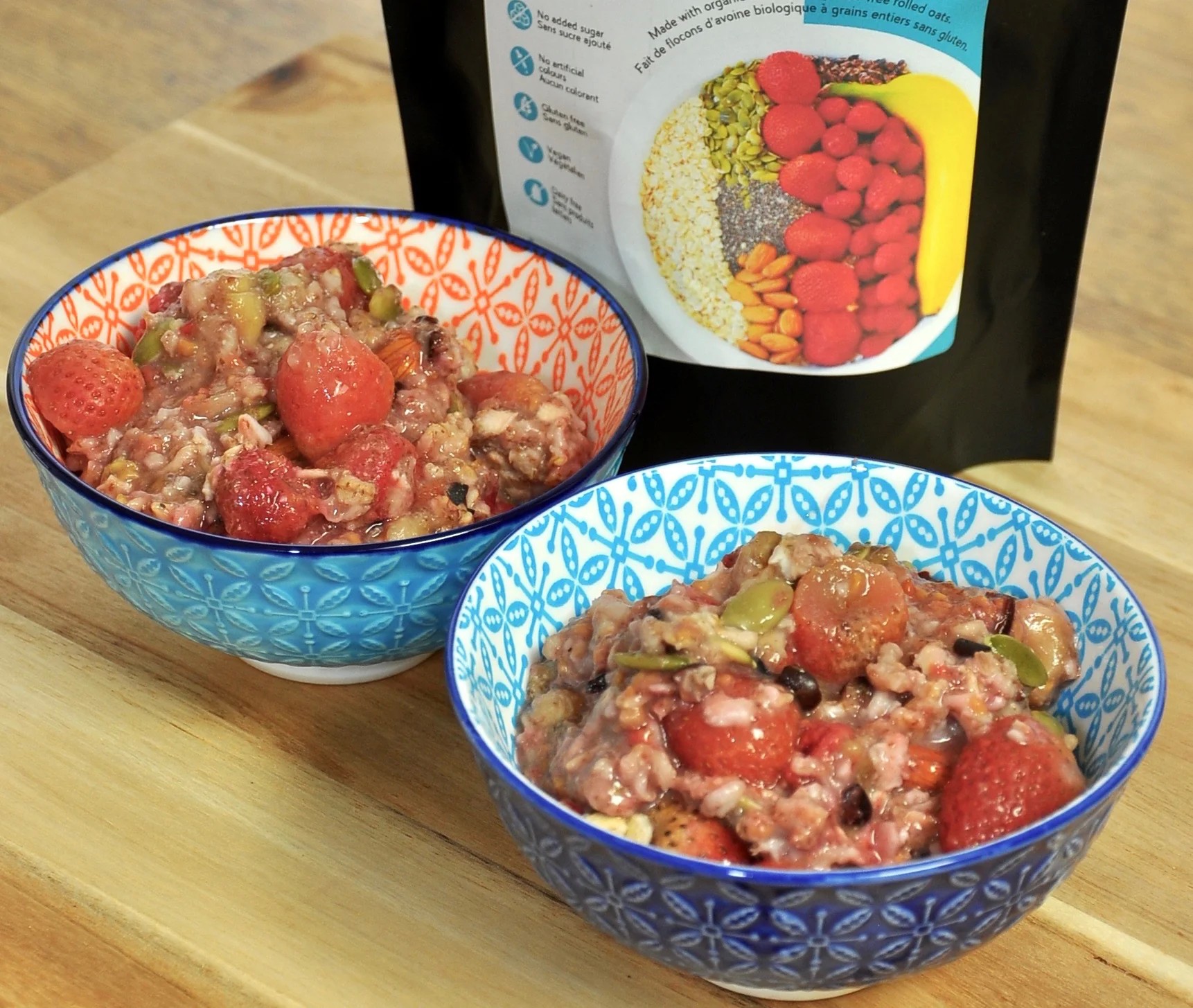 Ingredients: Strawberries, Raspberries, Organic Gluten-Free Oats, Bananas, Pumpkin Seeds, Almonds, Organic Raw Cacao Nibs, Chia Seeds, Organic Lucuma Powder